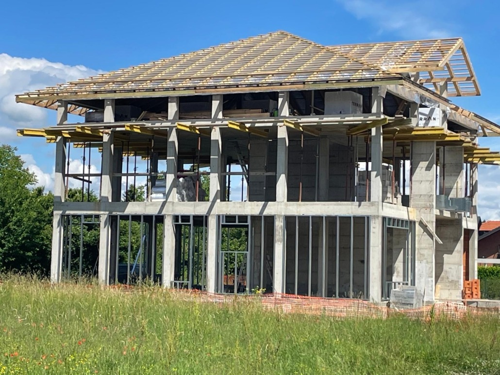 Kuća je građena od betonske konstrukcije (stupovi), osim garaže koja je zidana ciglom. Na ovu konstrukciju montirani su profili kao podloga za postav Skytech Pro XL izolacijske folije.